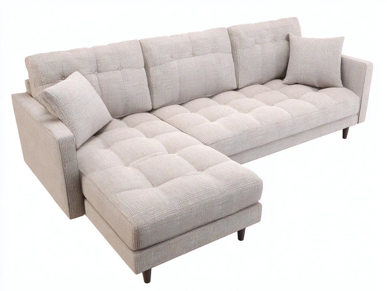 Komfortable Eckform mit erweiterter Liegefläche. Unterstützt entspanntes Sitzen und Ausstrecken. Geeignet als zentrale Sitzlösung für Wohnräume.