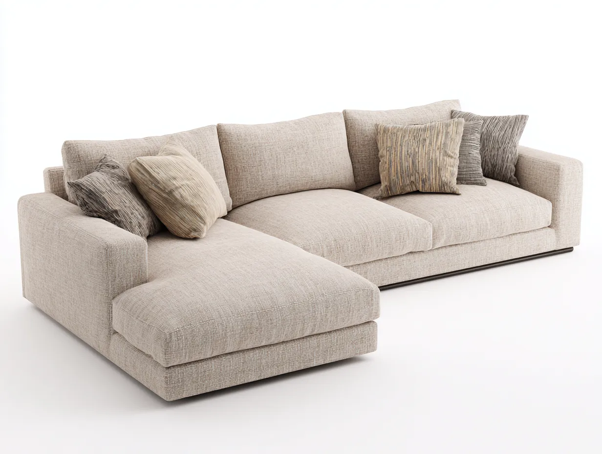 Erweiterte Liegefläche durch die Eckform. Unterstützt bequemes Sitzen und Ausstrecken. Gut geeignet als zentrales Möbelstück im Wohnzimmer.